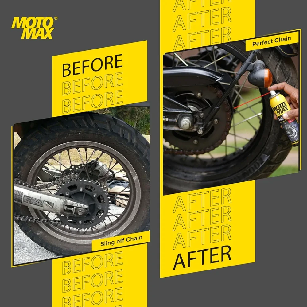 Cycling with solid fill Lubrication and corrosion protection of chains and sprockets::Cycling with solid fill COATS, PROTECTS AND PRESERVE: Motomax Chain Lube is a unique lubricant that coats, protects and preserves the chain and sprocket of vehicle; Forms a protective film on chain that avoids friction::Cycling with solid fill APPLICATION: Once sprayed on a clean & dried chain and wheel sprocket, it stays in place and then penetrates into the tightest areas to provide maximum lubrication while leaving a protective film as a barrier that clings:: Cycling with solid fill PREVENTS CHAIN BREAKAGE & KEEPS VEHICLE IN MOTION: It helps to keep the vehicle/machinery running smoothly, quietly & longer by preventing chain breakage and enhances chain life; Avoids Sling-off of chain.:: Cycling with solid fill Easy to use aerosol can.