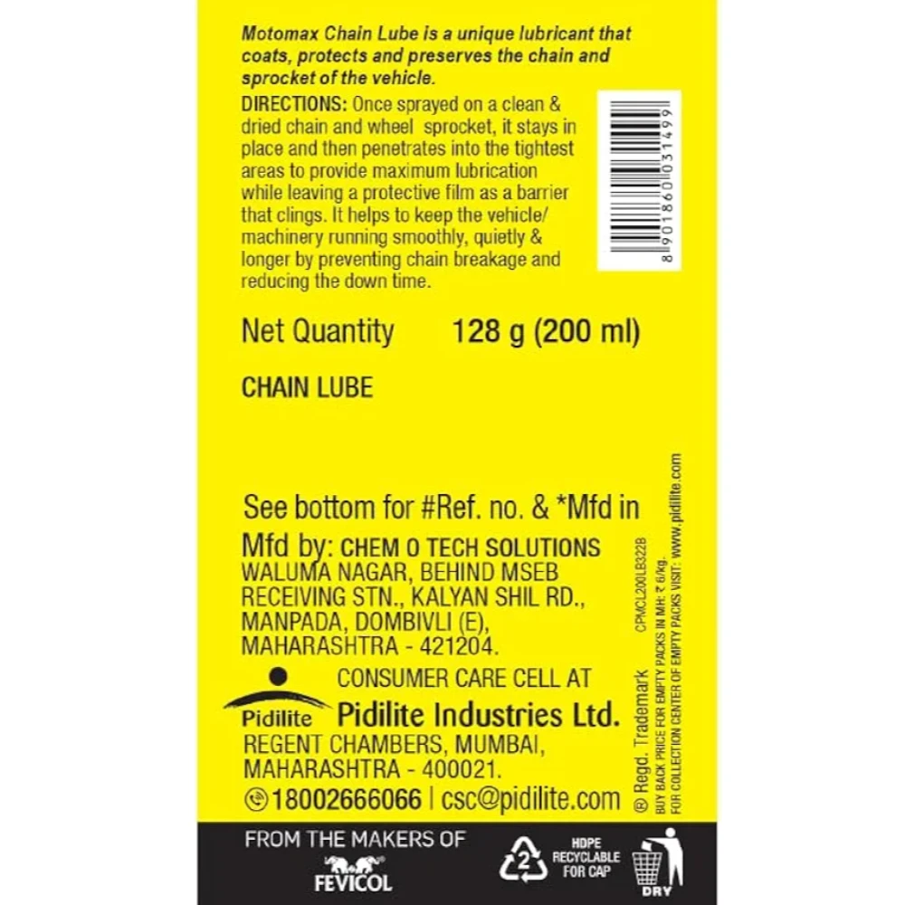 Cycling with solid fill Lubrication and corrosion protection of chains and sprockets::Cycling with solid fill COATS, PROTECTS AND PRESERVE: Motomax Chain Lube is a unique lubricant that coats, protects and preserves the chain and sprocket of vehicle; Forms a protective film on chain that avoids friction::Cycling with solid fill APPLICATION: Once sprayed on a clean & dried chain and wheel sprocket, it stays in place and then penetrates into the tightest areas to provide maximum lubrication while leaving a protective film as a barrier that clings:: Cycling with solid fill PREVENTS CHAIN BREAKAGE & KEEPS VEHICLE IN MOTION: It helps to keep the vehicle/machinery running smoothly, quietly & longer by preventing chain breakage and enhances chain life; Avoids Sling-off of chain.:: Cycling with solid fill Easy to use aerosol can.