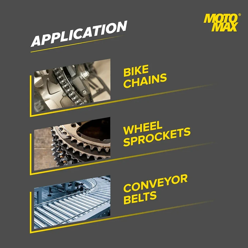 Cycling with solid fill Lubrication and corrosion protection of chains and sprockets::Cycling with solid fill COATS, PROTECTS AND PRESERVE: Motomax Chain Lube is a unique lubricant that coats, protects and preserves the chain and sprocket of vehicle; Forms a protective film on chain that avoids friction::Cycling with solid fill APPLICATION: Once sprayed on a clean & dried chain and wheel sprocket, it stays in place and then penetrates into the tightest areas to provide maximum lubrication while leaving a protective film as a barrier that clings:: Cycling with solid fill PREVENTS CHAIN BREAKAGE & KEEPS VEHICLE IN MOTION: It helps to keep the vehicle/machinery running smoothly, quietly & longer by preventing chain breakage and enhances chain life; Avoids Sling-off of chain.:: Cycling with solid fill Easy to use aerosol can.