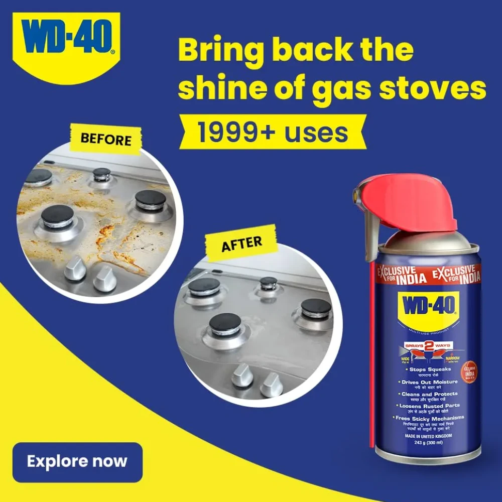 Multipurpose use - WD40 can be used for home improvement and automotive purposes and is an all in 1 spray as it acts as a rust remover, stain remover, lubricant, gets rid of squeaky door noises, loosens stuck parts, and much more::Multi surface applicability - this multipurpose spray can be used on multiple surfaces like metal, steel, iron, chrome, wood, aluminium, and more with ease either at home, office, on vehicles or any other commercial purpose::Great for lubrication - WD40 spray is an excellent lubricator for vehicle parts and household items like drawer, window channels, hinges, machines, treadmills, bike chains or any other moving parts with Its unique formula ensuring no external damage::Rust remover - WD40 can be used for removing rust from your car, bike, cycle, iron chairs and railings at home or any other metal objects around home and automobiles, a multipurpose spray that acts instantly and helps in household maintenance::Cleaning agent - the spray can be used as an active cleaning agent to remove grease, dirt, sticky and dust particles with ease and for removing sticker stains from any surface, clean expensive showpieces, silver or metals of any carbon deposit, etc::Great for degreasing - WD40 is also an effective car and household cleaning agent that can be used to effectively remove grime, oily and other smudges from various surfaces, including greasy kitchen chimney, oil spills, rigid stains,etc